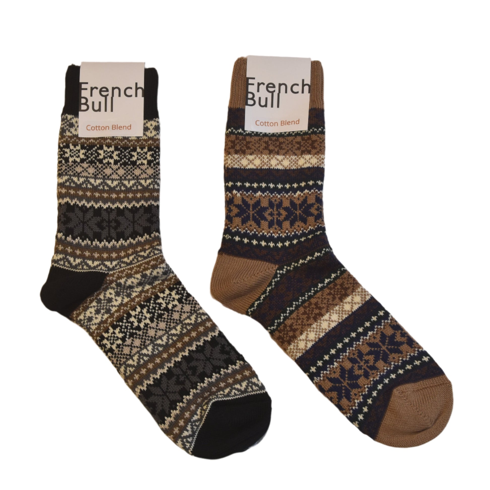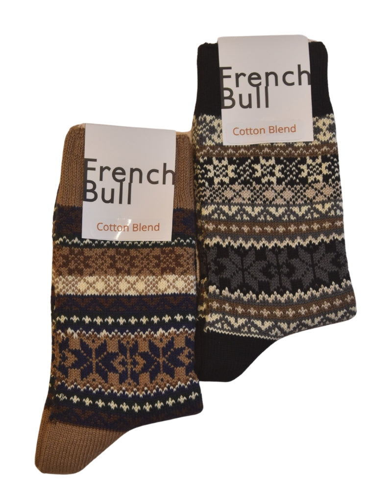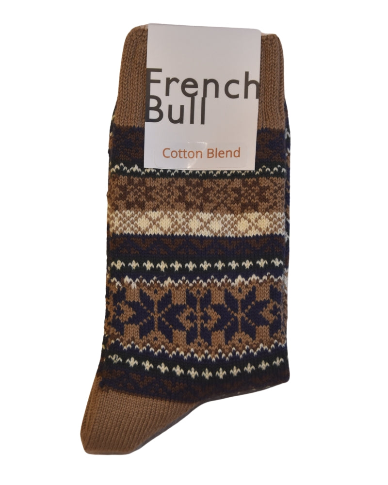 These socks feature a pattern inspired by nuts and fallen leaves. They are thickly knitted with soft cotton yarn and boast an eye-catching autumn color palette, making them the perfect statement piece to enhance any outfit.