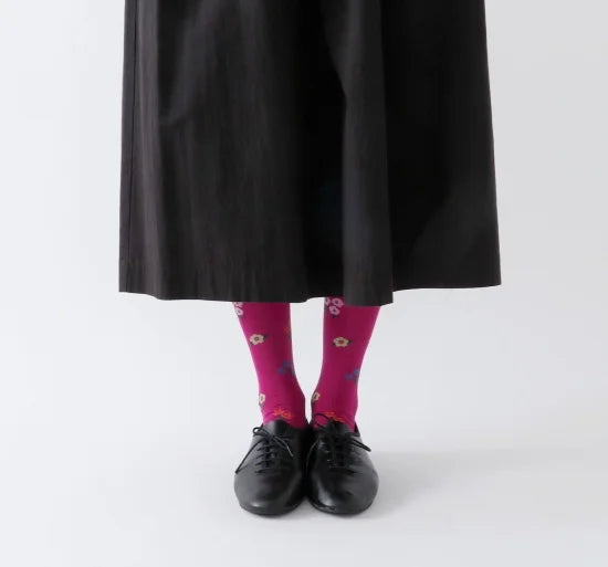 These socks are designed with the delicate charm of tiny flowers scattered across a meadow in mind. The base material is made from mercerized cotton yarn, treated with a gas burn process to reduce fuzz, resulting in a thin, smooth knit. The toe features a linking construction for a seamless finish, ensuring a comfortable fit.
