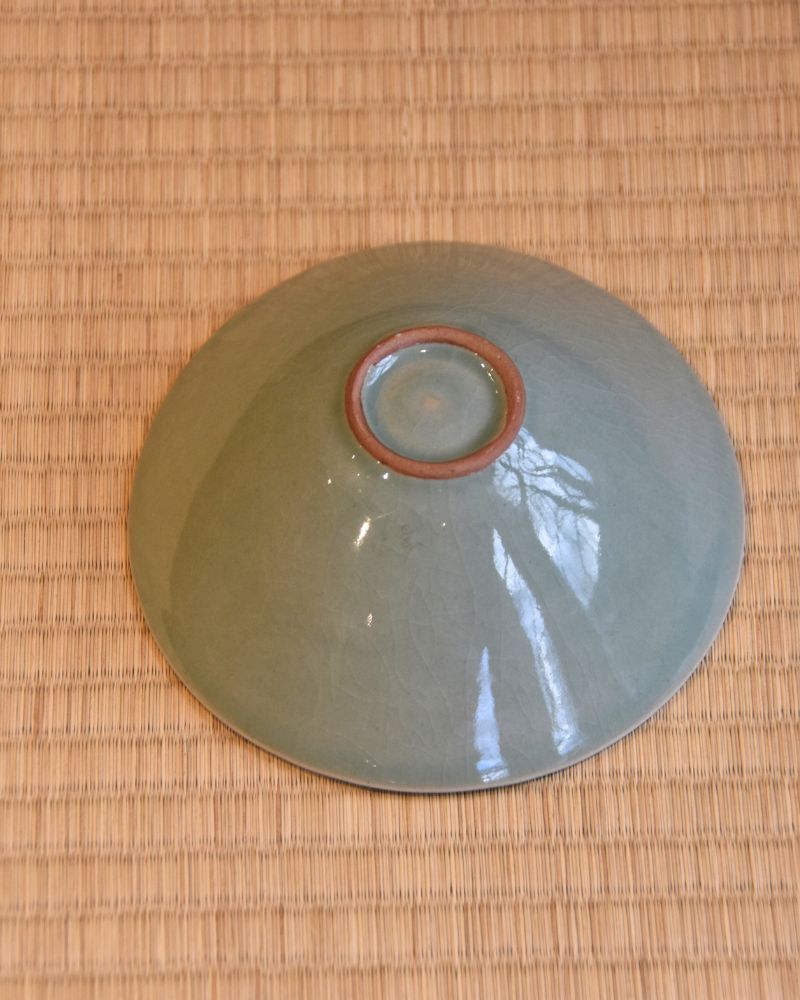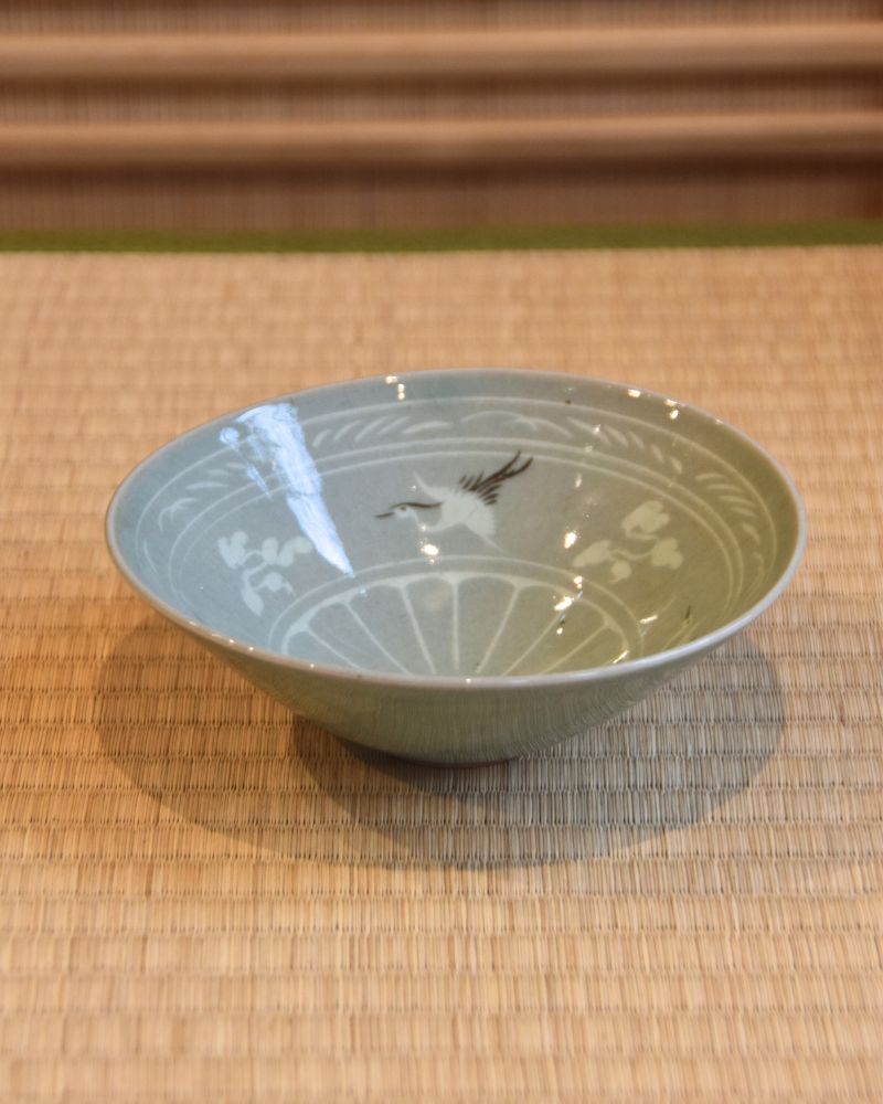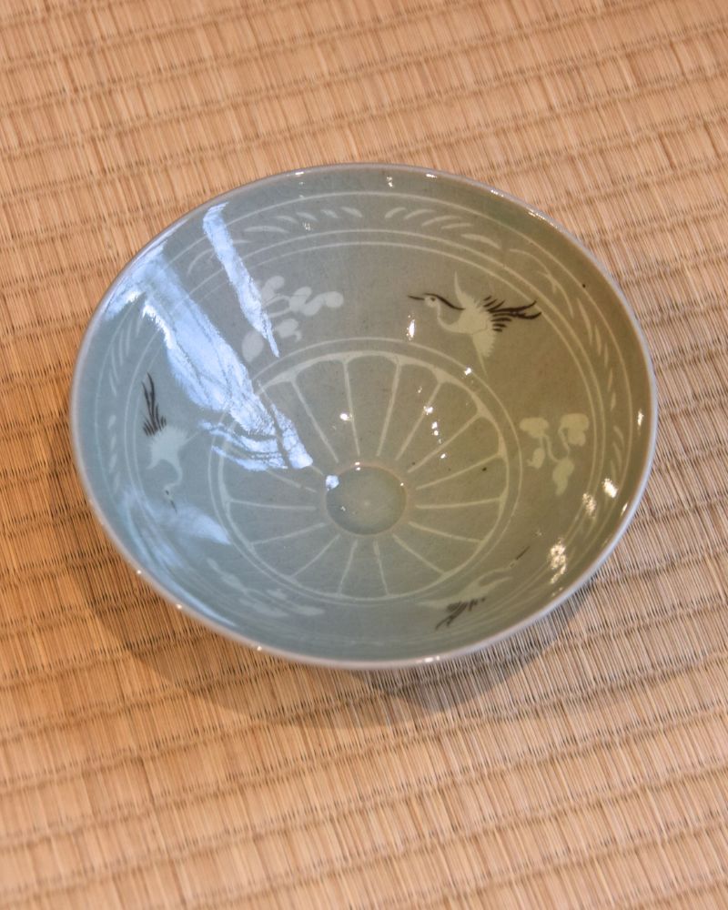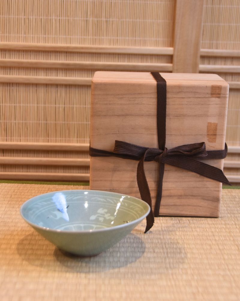 This Flying Cranes In the sky tea bowl features a delicate design of soaring cranes, symbolizing longevity and good fortune.
