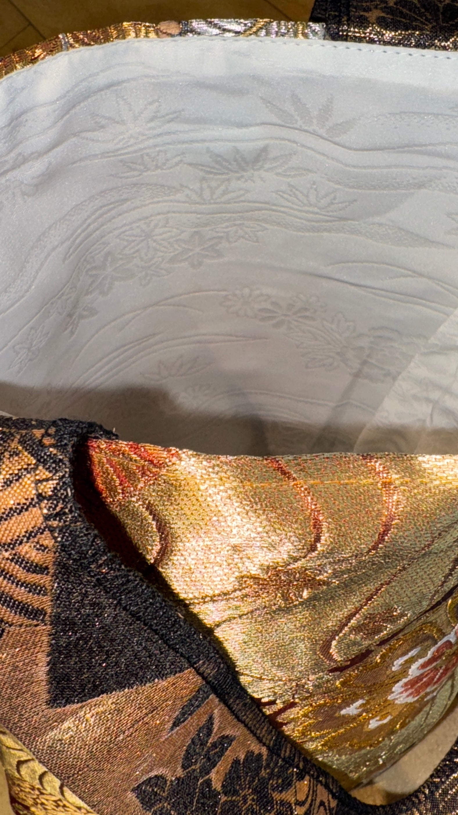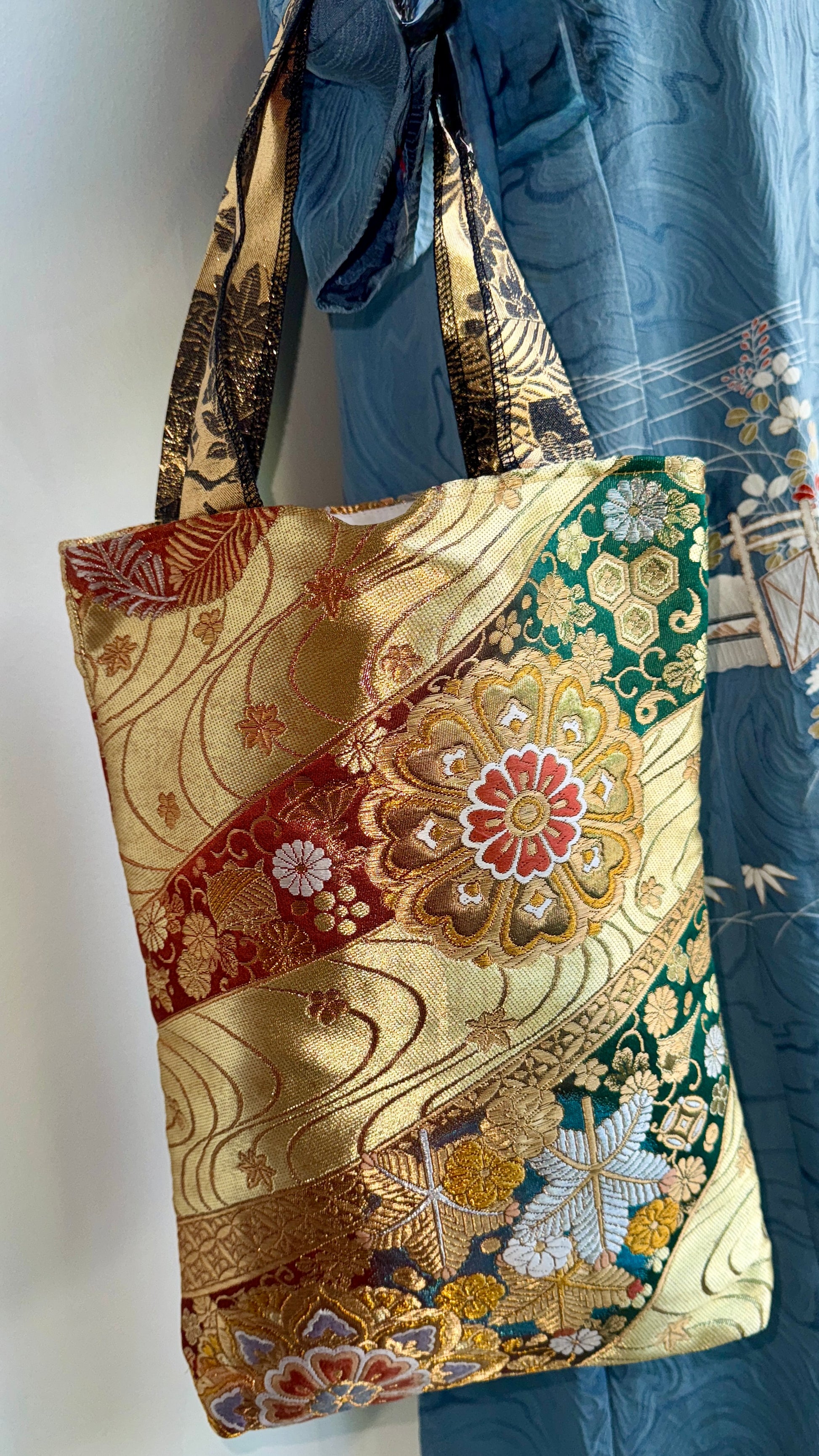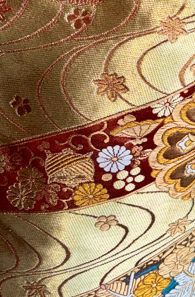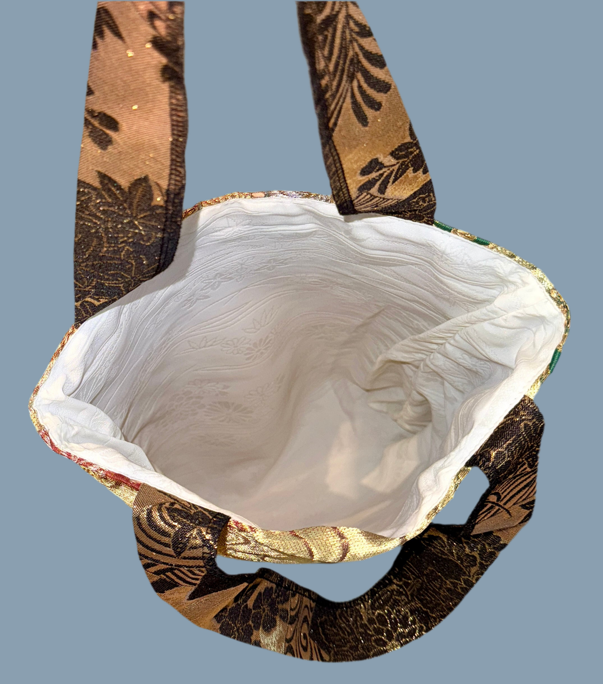 The obi is adorned with vibrant embroideries on both sides, exuding elegance. The golden mum accents add a luxurious touch, making this bag a stand out winner.