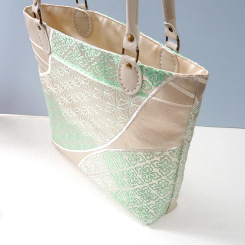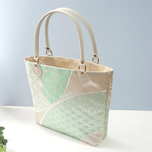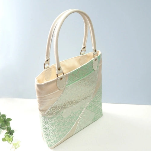 A 100% silk bag with traditional geometric Japanese hemp patterns. It features very elegant and refined colors. Teal and white like the winter wind.