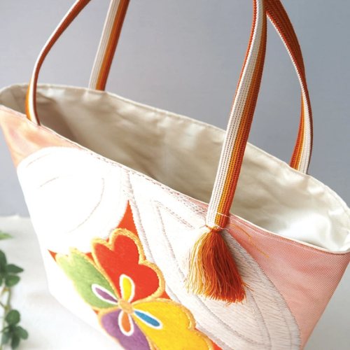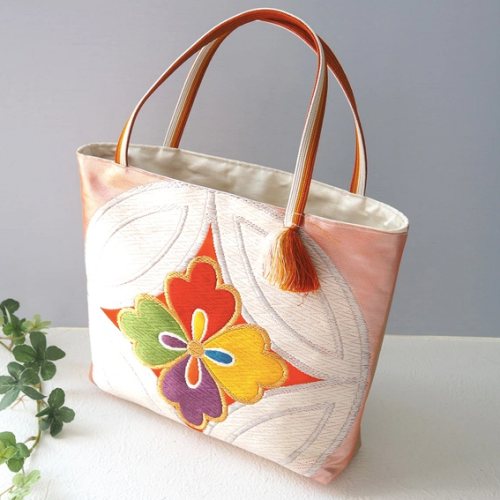 The elegant handle is an upcycled obi-jime (a cord for tying an obi). The vibrant color combination of the obi and the base fabric is very cute. The kimono obi with auspicious patterns such as this are gorgeous and timeless.