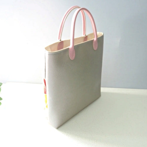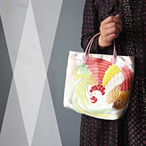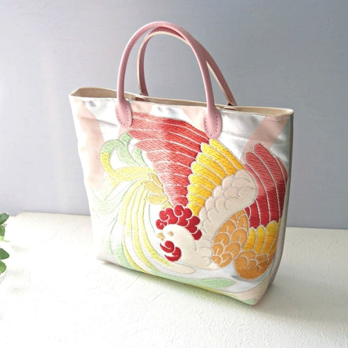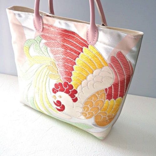 This Nishijin kimono obi tote bag exudes elegance with its intricate phoenix motif, a symbol of rebirth and renewal in Japanese culture. Faux leather handle.