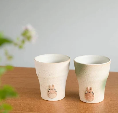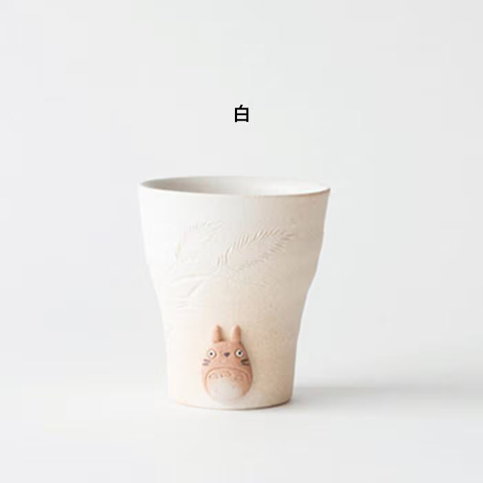 Totoro is depicted standing watch in a field of grass, Buy as a single of the white or green color or as a set of cups. The cups are available in two colors, white and green, with the gentle texture of Shigaraki-yaki clay. Each cup is is handmade/hand-painted one by one, so there may be variations in color, pattern, and size.