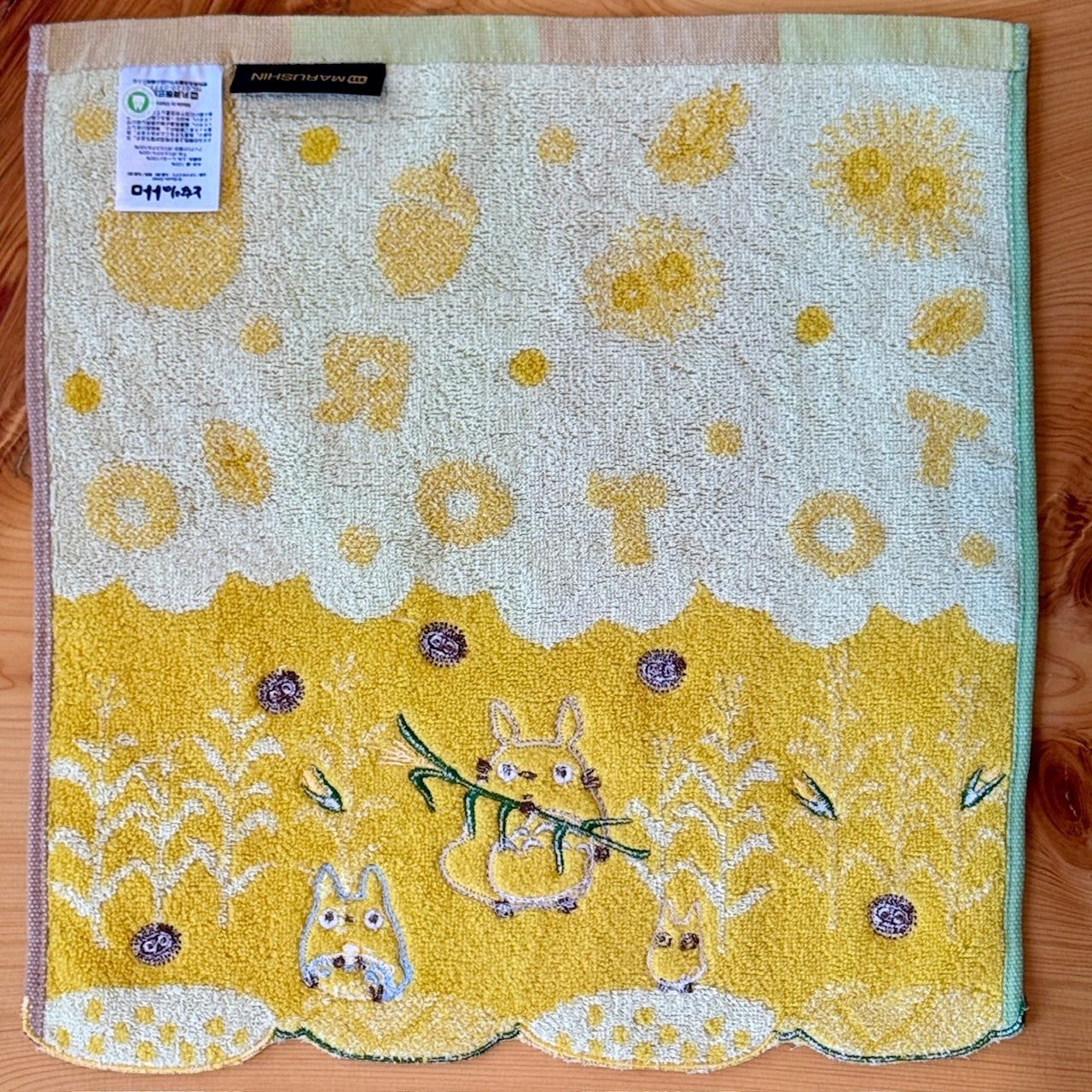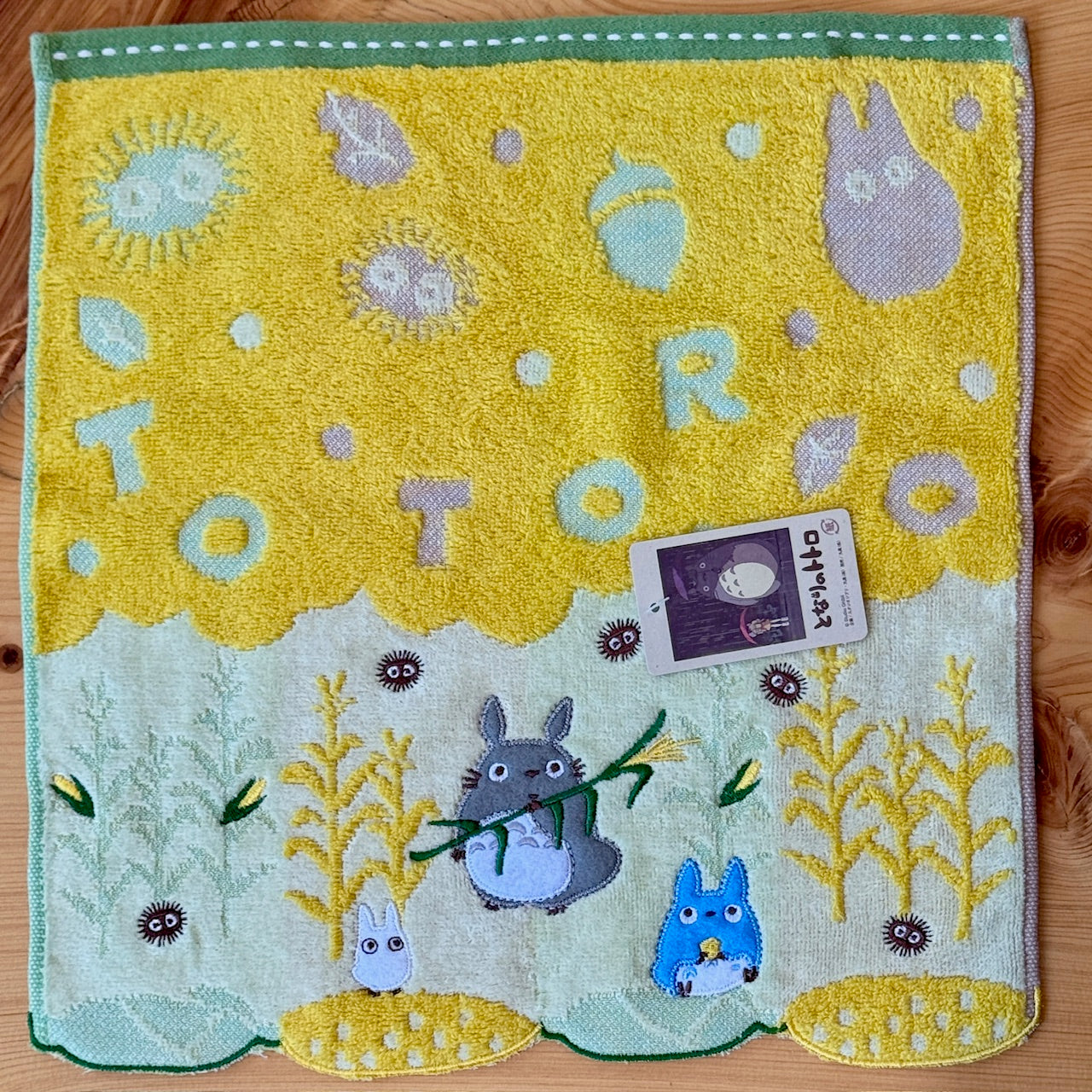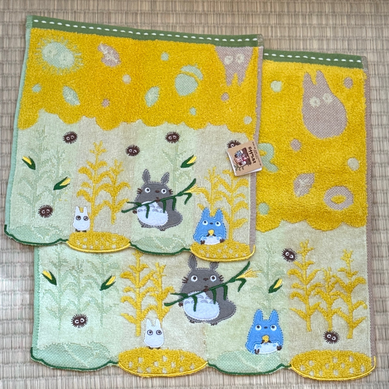 Bring the magic of Totoro into your daily life with this adorable wash towel, made from 100% soft, high-quality cotton. This cheerful towel features Totoro holding a corn stock and his forest friends among golden cornfields, with embroidered details of playful soot sprites and acorns scattered throughout.